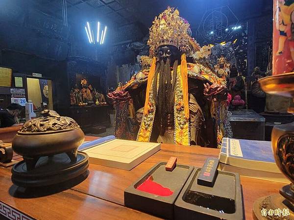 城隍爺升堂連續3天辦公,案前擺著用來批示的紅、黑墨水及毛筆、公文簿。 (記者王姝琇攝)