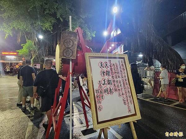昨晚普度結束後,廟方依大駕指示將開庭物件就定位,安座在行台中央的正是城隍爺,案前擺著用來批示的紅、黑墨水及毛筆、公文簿,讓城隍爺紀錄下受理的案件;七爺八爺、文武判則在兩側待命形同法警,從廟埕前一路延伸到城隍爺案桌前,走道兩旁排著嚴肅威武的執事牌及大鼓,並於今天凌晨完成公告張貼,開放各方可以前來「有冤伸冤,有屈伸屈」。