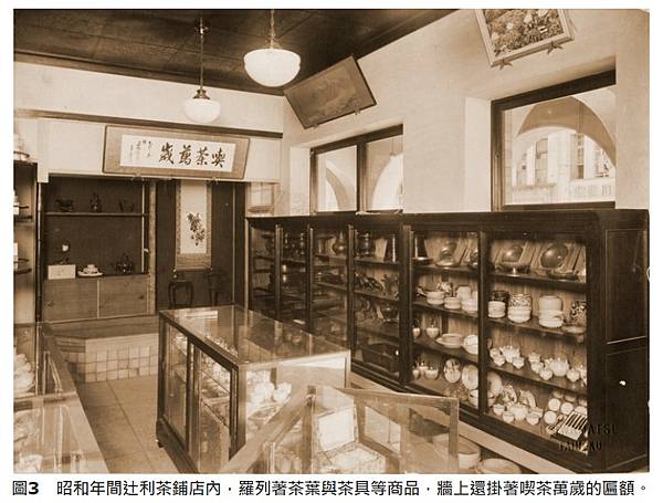 圖3 昭和年間辻利茶鋪店內,羅列著茶葉與茶具等商品,牆上還掛著喫茶萬歲的匾額。