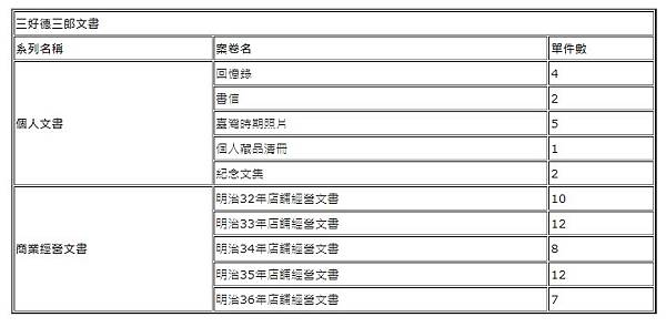 範圍與內容 三好德三郎文書由個人文書及商業經營文書組成。個人文書包含:回憶錄、書信、臺灣時期照片、個人藏品清冊,共計96件。商業經營文書包含三好德三郎在臺灣經營辻利兵衛出張茶舗所產生的相關文件,時間範圍自明治32年至明治36年,共計49件。本文書自日本京都府宇治市歷史資料館徵集的書信及商業經營文書採影本方式提供。