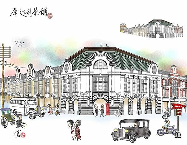 而圖中這間曾作為郵便局,以及販售各式茶葉及菓子的辻利茶舖,現在變成了星巴克。圖中細節甚多,騎樓甚至還有當時店面的化妝品大廣告,都很引人注目