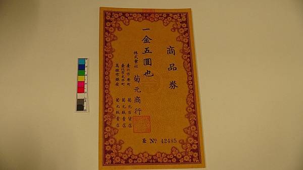 拍攝菊元文物時,團隊意外發現菊元百貨店商品券,上面記載著「一金五圓也,株式會社菊元商行」字樣,背面則是商品卷的使用方法,指出該卷不分時段皆可憑卷向店員兌換商品。不知道這是否就是台灣後來許多百貨禮券的前身呢?