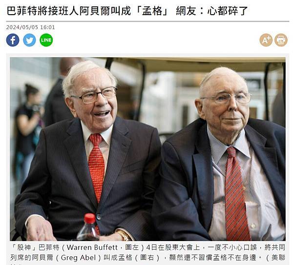 巴菲特將接班人阿貝爾叫成「孟格」 網友:心都碎了 - 自由財經 https://bit.ly/3WtubmZ