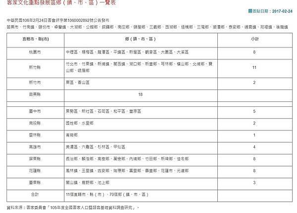 客家文化重點發展區鄉(鎮、市、區)一覽表
