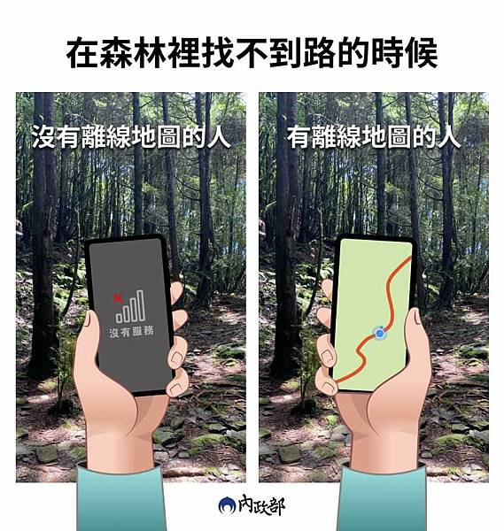 面對未知的天氣及不熟悉的路況,如果沒有熟門熟路的登山嚮導與自己相伴而行,就有可能發生可怕的野外迷航,建議民眾登山之前要先了解自己要走的步道路線,並善用「離線地圖APP」,將登山路線的地圖資訊下載好,以備在山裡面收不到訊號時,手機打開來還是可以看到地圖資訊。