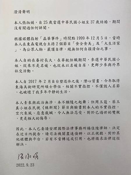 本人張淑娟,自25歲當選中華民國小姐至37歲結婚,期間沒有鬧過任何緋聞。根據媒體指射「晶華事件」時間點1999年12月5日,當時本人在東森電視台主持2個節目「食全食美」及「大生活家」,為公眾人物,嚴謹自律,絕無任何自損清白之事。