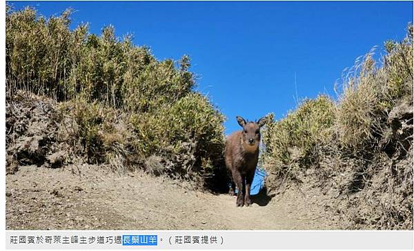 莊國賓說,當時走在步道上,長鬃山羊出現在100公尺之外,長鬃山羊也看到前面有人,原本以為會害怕跑開,但牠還是慢條斯理向他跟妻子這邊走來,到了僅容1人通行的步道,他們則是暫退一旁禮讓山羊先過,人羊互看幾眼後各自安然離去,這樣與動物平和的相遇相視令人驚喜珍惜。