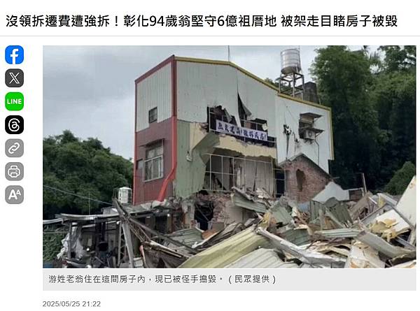 沒領拆遷費遭強拆!彰化94歲翁堅守6億祖厝地 被架走目睹房子被毀 - 生活 - 自由時報電子報 https://bit.ly/4duSl77