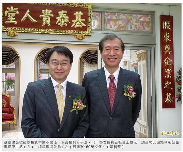 投資中國房產吸金移送-建商基泰建設老董陳世銘總經理馮先勉被控以投資中國不動產、保證獲利等手法,向十多位投資者吸金上億元