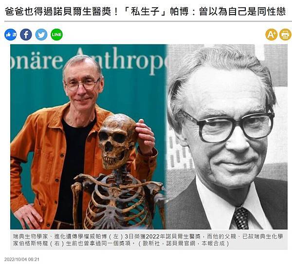 父子都得諾貝爾奬!新科醫學獎得主是私生子 、曾出櫃 特殊身世曝光 - 國際 - 中時新聞網 https://bit.ly/3MimtoZ