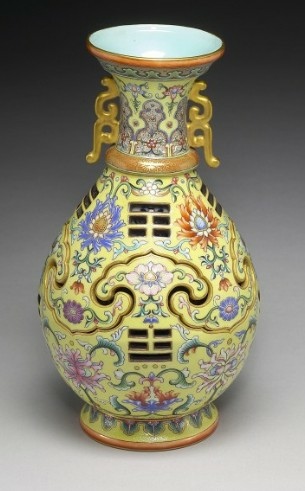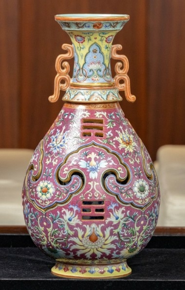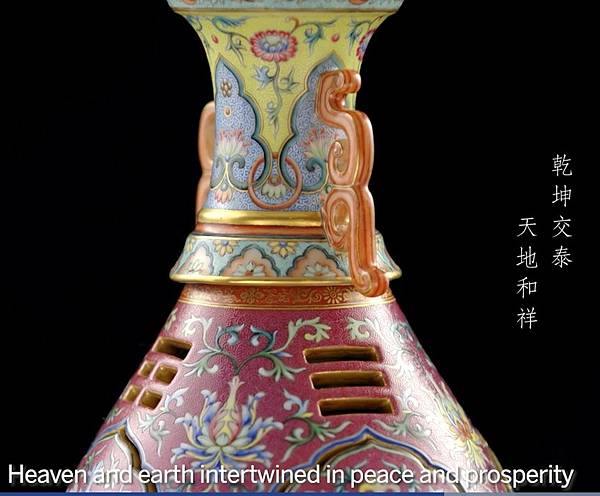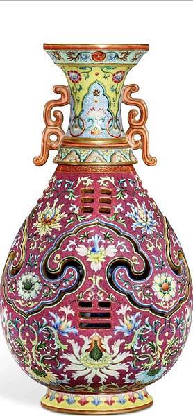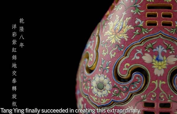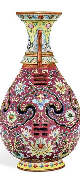 欲尋一器以總結乾隆帝的藝術美學觀念,兼展示當時江西景德鎮御窰的工精技絕,難矣。然此瓶,巧奪天工,鏤雕、交泰、轉旋集匯一身,以中國禎祥紋樣,搭襯西方巴洛克風圖案,且配色艷麗,紫紅明黃妙相合,隙地錐剔鳳尾卷草錦紋,誠鬼斧神工,超前絕後。乾隆帝(1736-95年間在位)善鑑好藏,要求嚴格謹慎之處,無出其右,一般難以取悅,然接獲如此巧製佳瓷,也是無可挑剔了。據清宮檔案,此瓶當是乾隆八年(1743年)或即後數年燒成,時皇權正盛,御窰發展更是攀峰登極。