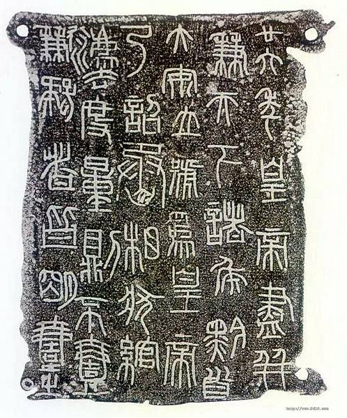 《秦詔版》,青銅刻。古時帝王下詔書,將詔書內容刻在金屬版上稱為“詔版”。可以存垂久遠。秦詔版刻字,風格大體近於東巡刻石,但因金屬的堅硬性質,鐫刻時曲圓婉通的筆調已經走樣,不及石刻、木刻那樣流暢,但仍不失為學習秦篆的珍貴資料。----《古代碑帖鑑賞》