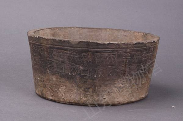 口徑20.5,底徑17.7,高9.3,厚1厘米。泥質灰陶。平口,直壁略收,平底,口沿下有一周弦紋。腹部有篆書印文二十行四十字:“廿六年,皇帝盡並兼天下諸侯,黔首大安,立號為皇帝,乃詔丞相狀,綰、法度量,則不壹,歉疑者,皆明壹之。”內底戳印“騶”字兩個,口沿戳以“馬”字。