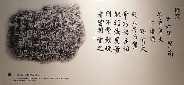 大致意思是:「秦始皇二十六年(公元前221年)統一了天下,百姓安寧,立下皇帝稱號,於是下詔書於丞相隗狀、王綰,依法糾正度量衡器具的不一致,使有疑惑的人都明確起來,統一起來」這些文字詔書下放是隨同權、量一起下發的,而統一過的「權」與「量」上也同樣刻上了相同的內容。