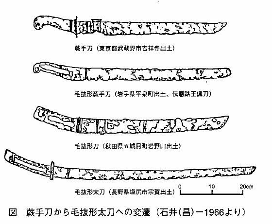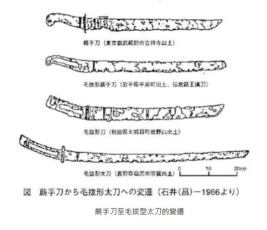 總體上來說,日本刀存在一個:蕨手刀-毛拔蕨手刀-立鼓柄刀-毛拔太刀-太刀-打刀的演變過程。