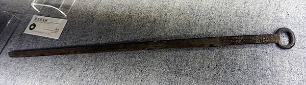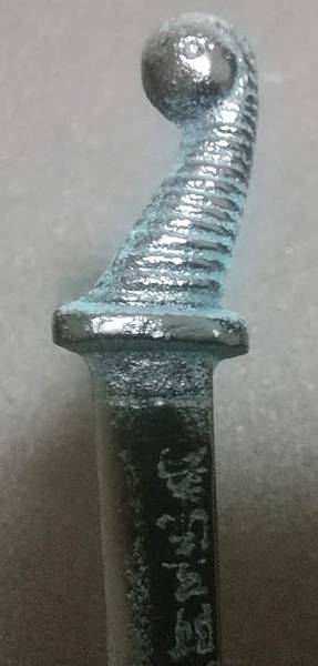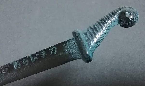再來,綁了一些花俏的刀繩,而刀刃還沒有弧度,是筆直一線的,最特別的地方則是,刀柄竟然是彎曲的
