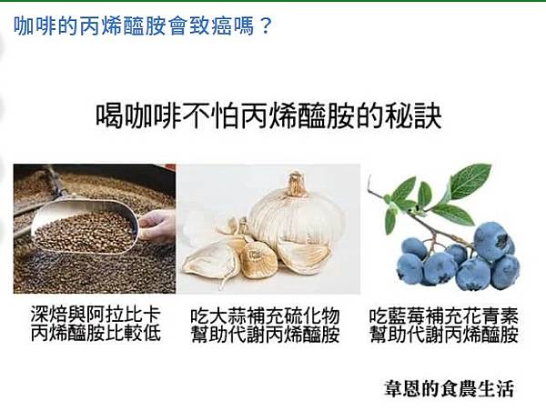 ⚫以其他食物幫助肝臟代謝掉丙烯醯胺,要幫助肝臟代謝掉丙烯醯胺,也可以配個大蒜或是配個藍莓,有助加速代謝速度。