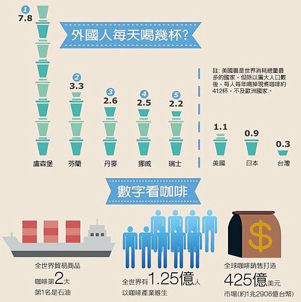咖啡受到全世界喜愛,重要程度與水、茶、啤酒不相上下,所以每日的飲用量有這麼多!我一天喝5杯,應該也貢獻了不少數字?(笑)各位親愛的咖啡同好,眾人的力量真是不可小覷!