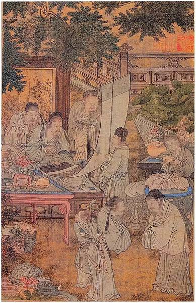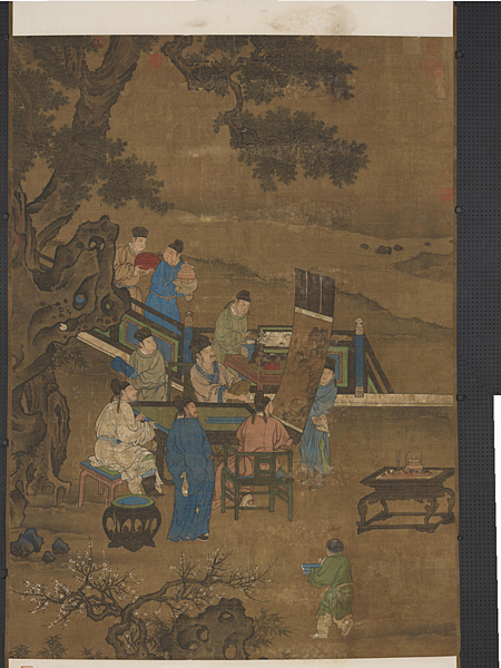 主題與關鍵字:奇石、高士(士人、隱士)、侍從(侍女、僮僕)、松、竹、柏、庭院、欄杆、傢俱(屏風)、飲食器、花器、文房用具、文玩(琴棋書畫)。石渠寶笈續編(寧壽宮),第五冊,頁2718