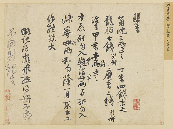 北宋書法家黃庭堅自稱有「香癖」,是位不折不扣的「香味控」。他最愛的一款香是「嬰香」,將角沉(海南島沉香之最)、丁香、龍腦、麝香等香料研磨成粉後,調勻加蜜高溫熬煮,蔭涼一個月後而成。圖為黃庭堅的「書嬰香方」。圖/故宮提供