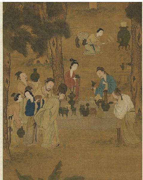宋時,收藏成為一時熱潮,宋人將收藏稱之為「博古」,意在追求博古通今的趣味。知名書畫收藏家劉文杰先生曾指出:「從中國書畫鑑藏史上講,中國有五次收藏高潮,第一次是宋朝,第二次是明朝,第三次是清代乾隆年間,第四次是清末民國時期,以1993年中國成立收藏家協會為標誌,中國進入了第五次收藏高潮。」 收藏熱的出現,使得宋朝時期出現了大量描繪博古題材的繪畫作品。宋時博古圖主要分為兩大類,一類是為了便於收藏者直觀的鑑別文物而在一些金石學著作中臨摹繪製的古玩插圖,即為博古圖譜;另一類是描繪宋人如何玩收藏、鑑賞文物的捲軸畫,即為博古圖軸。今天介紹的博古圖描繪的便是文人墨客把玩古董的場景。