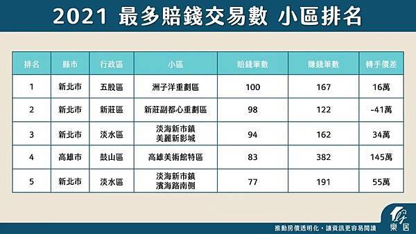 2021年賠錢筆數最多的分別是「五股洲子洋」、「新莊副都心」、「淡海美麗新影城」、「高雄美術館特區」、「淡海濱海路南側」,賠售筆數大約在80至100筆,不過除了新莊副都心以外,其他的區域整體來說「還是賺錢」。