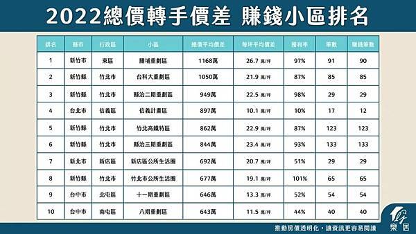 樂居統計2022年到8月,最賺錢的生活圈前10名,新竹縣市就包辦6名,包含前3名「關埔重劃區」、「台科大重劃區」、「縣治二期重劃區」,還有5、6名的「竹北高鐵特區」、「縣治三期重劃區」,以及第8名的「竹北市公所生活圈」,總共526筆交易中,僅有一筆未獲利。