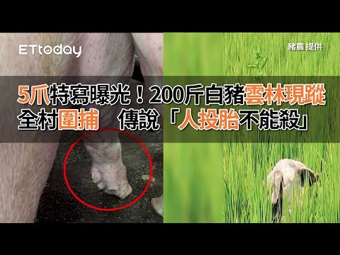 雲林縣大埤豐岡村近日出現一頭重逾百公斤大白豬,四處流竄破壞莊稼,警民合力之下終於圍捕成功,仔細一看是頭罕見的「五爪豬」,早年相傳宰殺牠們會帶來厄運,懷疑因此遭到放生。當地豬農坦言,雖然傳統觀念逐漸淡化,但通常五爪豬流入市場,價格幾乎就是攔腰砍半。獨家/人類投胎失敗?解密傳說「五爪豬」 豬農曝業界規則價格剩6成 - 民視新聞網 https://bit.ly/3EStL0Z