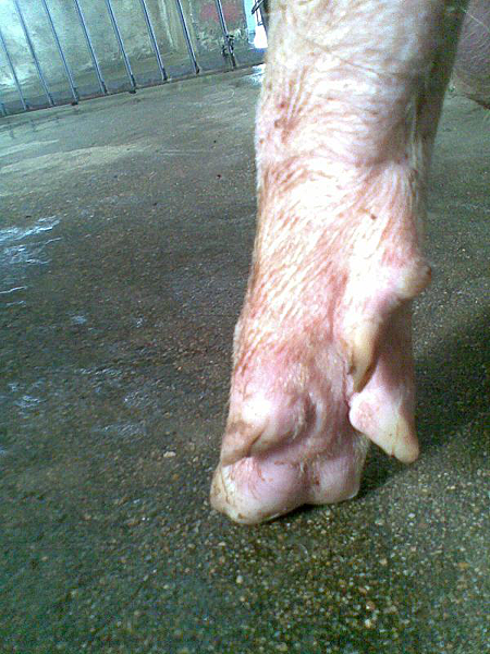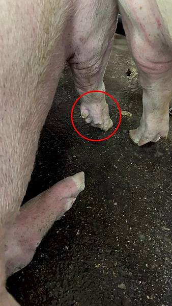 屠宰業界視「五爪豬」為一大禁忌,圖中豬隻前蹄旁便多出一個小蹄。(記者謝介裕攝)
