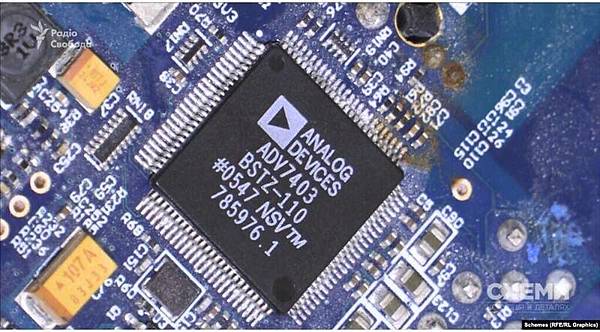 該無人機採用美國IC大廠亞德諾半導體(ADI)的「ADV7403」影像解碼晶片。(圖擷取自烏克蘭國安局推特)