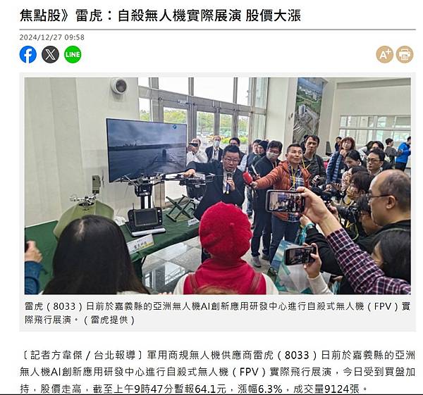 軍用商規無人機供應商雷虎(8033)日前於嘉義縣的亞洲無人機AI創新應用研發中心進行自殺式無人機(FPV)實際飛行展演焦點股》雷虎:自殺無人機實際展演 股價大漲 - 自由財經 https://bit.ly/409oRqi