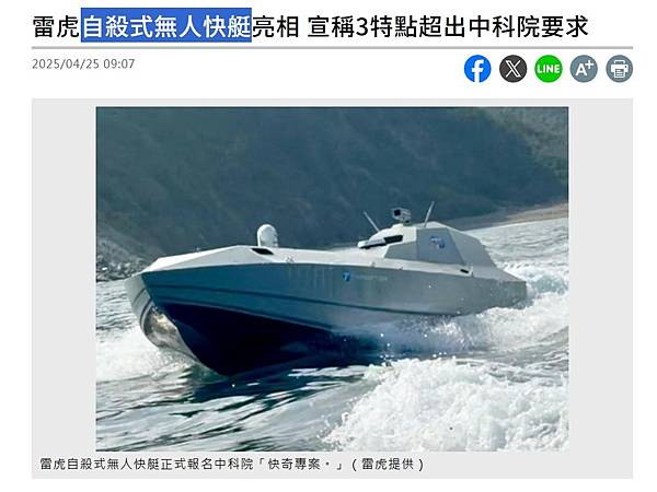 雷虎自殺式無人快艇正式報名中科院「快奇專案。」(雷虎提供)