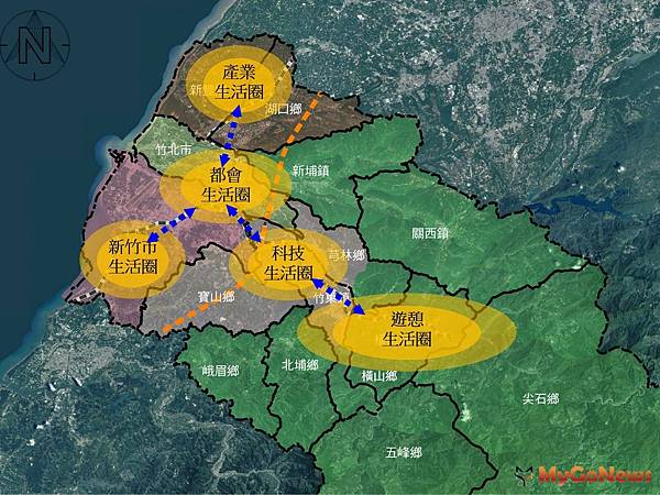 5大路廊將配合原有的台鐵縱貫線、內灣支線與高鐵站、新竹市輕軌站等轉乘節點,串連新竹縣產業支援生活圈(新豐鄉、湖口鄉)、都會核心生活圈(竹北市)、科技商務生活圈(竹東鎮、芎林鄉、寶山鄉)和人文遊憩生活圈(新埔鄉、關西鎮、橫山鄉、北埔鄉、五峰鄉)等各生活圈。