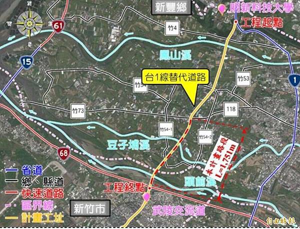 新竹縣長楊文科表示,台1線替代道路的整體計畫路線,起點於台1線新豐鄉明新科技大學,終點銜接台68武陵路交流道,因整體建設規模及經費龐大,規劃採分期建設方式辦理,此次優先路段工程全長約1751公尺,包括跨越新社圳、澎湖圳、豆子埔溪及頭前溪等橋梁,橋梁總長約812公尺。完工後可提供替代交通動線,緩解尖峰時段台1線交通流量,並透過替代道路興建,帶動周邊地區商業、觀光發展,加強地區交通服務,促進沿線土地利用。
