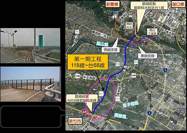 工務處表示,此計畫起點為新豐鄉台1線65K+500,終點為台68線快速道路武陵匝道 ,長度約4.4公里;兩支線起點與台1線形成T字路口,東側延伸支線銜接湖口鄉榮光路進新竹工業區,西側支線銜接新豐鄉德昌街及竹5線,主線加上兩支線合計7.3公里