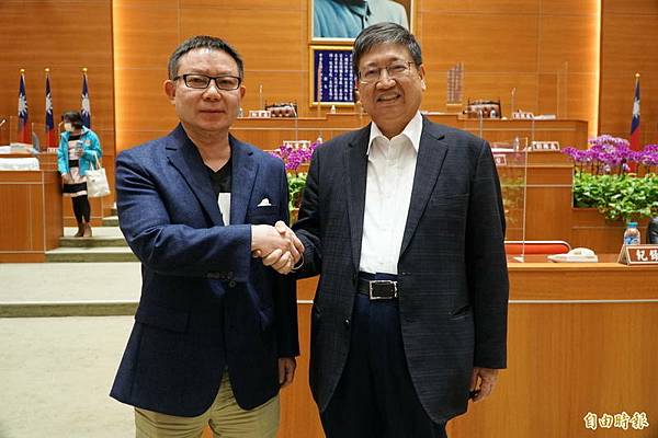 新竹縣議會今天3讀審議通過111年度新竹縣總預算,縣長楊文科(右)向議長張鎮榮(左)致謝。(記者廖雪茹攝)