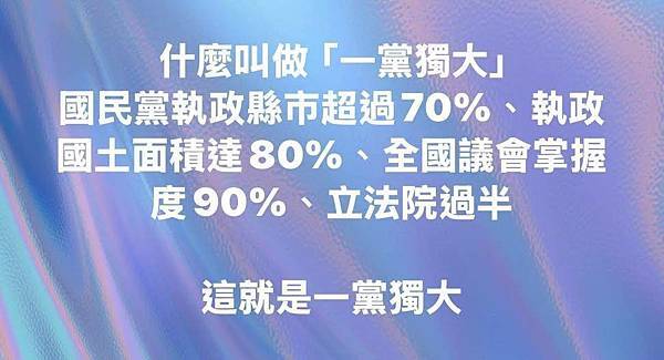 這樣推論的連鎖,該有多滑坡姑且不論,台灣目前的政治現況可以算得上是「一黨獨大」嗎?倘若政治情勢變成「一黨獨大」真的就會「萬劫不復」、「十惡不赦」嗎?