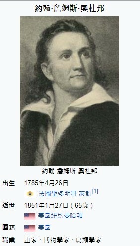 約翰·詹姆斯·奧杜邦(John James Audubon,1785年4月26日-1851年1月27日),美國畫家、博物學家,法裔美國人,他繪製的鳥類圖鑑《美國鳥類》被稱作「美國國寶」。約翰·詹姆斯·奧杜邦 - 維基百科,自由的百科全書 https://bit.ly/3NhzTSn