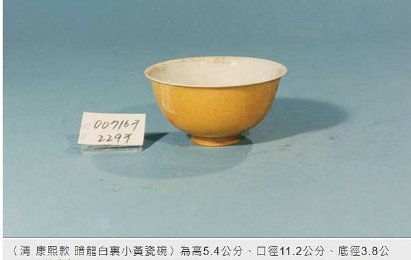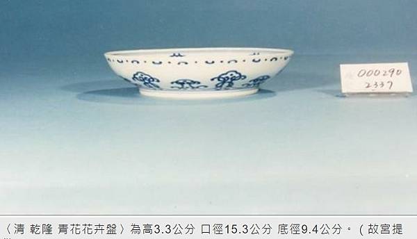 另2件目前故宮資料記載相對簡單,〈清 康熙款 暗龍白裏小黃瓷碗〉為高5.4公分、口徑11.2公分、底徑3.8公分。〈清 乾隆 青花花卉盤〉為高3.3公分 口徑15.3公分 底徑9.4公分。