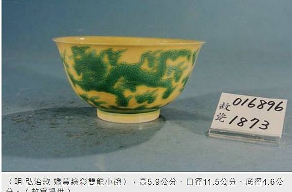 據故宮內部可查詢的資料,編號106896的〈明 弘治款 嬌黃綠彩雙龍小碗〉,高5.9公分、口徑11.5公分、底徑4.6公分,資料說明為「均侈口窄唇,深壁,矮圈足。外面彫刻雙龍戲珠,隙地加飾朵雲,底邊飾波濤紋,內面樸素無紋飾。薄胎骨,嬌黃泑,花紋加填綠彩。底均有青花書「大明弘治年製」六楷字款,外加雙圈。」