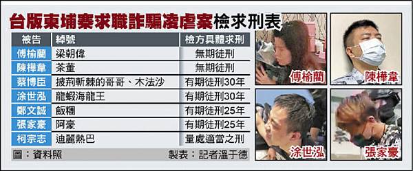 傅榆藺、陳樺韋遭求處無期徒刑,「木法沙」蔡博臣、「蝦董」涂世泓各求刑30年徒刑,詐團成員鄭育賢及控員幹部謝承佑、呂政儀、鄭文誠、張家豪等5人求處25年,詐團成員鄭建宏、劉宏翊、邱柏倫等3人,求刑20年;其餘被告檢方建請法院量處適當之刑。