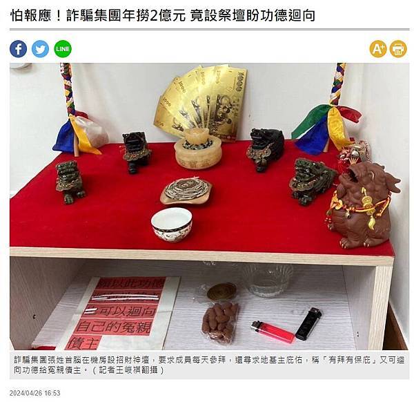 詐騙者有信仰沒約束--- 怕報應!詐騙集團年撈2億元 竟設祭壇盼功德迴向 - 社會 - 自由時報電子報