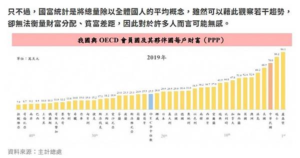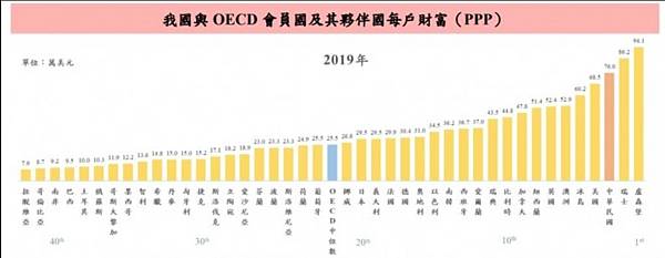 主計總處表示,觀察我國與OECD會員國(38國)及夥伴國(3國)每戶財富(PPP),2019年以盧森堡94.1 萬美元最高、其次為瑞士86.2萬美元,拉脫維亞及哥倫比亞較低,各為7.9及8.7萬美元。我國76.0萬美元,高於OECD國家(41國)中位數25.5萬美元,排名僅次於盧森堡與瑞士,在42個國家(含我國)中排名第3,優於亞鄰之南韓(第14,36.2萬美元)及日本(第20,29.5萬美元)。