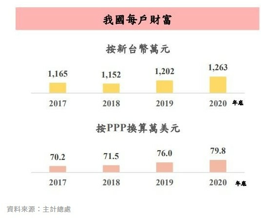 主計總處表示,2020年底我國家庭部門「平均每戶」資產負債淨值(不含人壽保險及退休準備)依新台幣計算為1263萬元,較2019年底增62萬元或增5.1%,主因金融性資產淨值增55萬元(其中每戶「有價證券」增37萬元、「現金及活期性存款」增25萬元)所致;較2017年底亦增98萬元或增8.4%。若依購買力評價(PPP)換算,2020年底我國每戶財富(PPP)79.8萬美元,較2019年底增3.8萬美元或增5.0%;較2017年底亦增9.7萬美元或增13.8%。