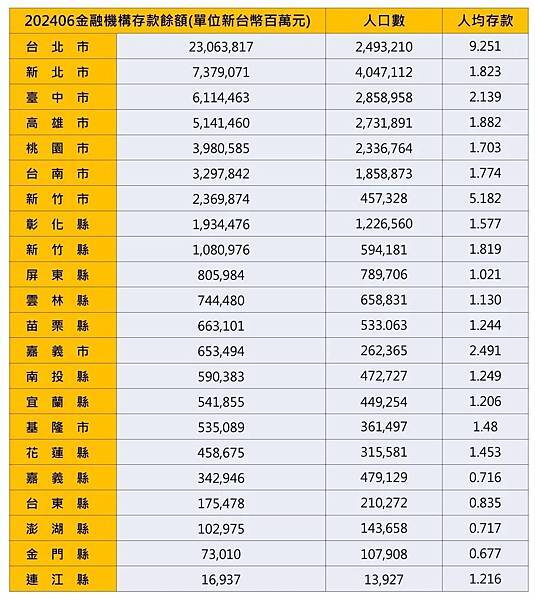 金融機構存款餘額,前三名-北市奪冠,人均存款高達925萬元,第二名是新竹市518萬元,嘉義市以249萬元位居第三, 第四名台中市213萬元,第五名則是高雄市188萬元。 全台存款餘額 https://bit.ly/41ziBcK