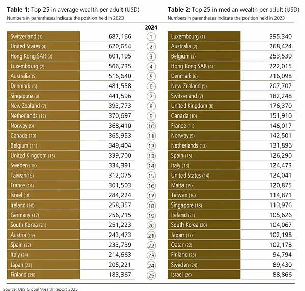 瑞士銀行集團(UBS)日前釋出年度「全球財富報告」,指出相較於前(2023)年,去(2024)年全球財富增長4.6%;不過,財富增長集中於北美,美國更佔據大多數的成長份額,增長率達11%。台灣方面,去年平均每位成年人擁有31萬2075美金(約944.7萬台幣)資產,中位數則是11萬4871美金(約347.7萬台幣),分別排名世界第15、第17,兩者皆高於日本、南韓等亞洲強權。