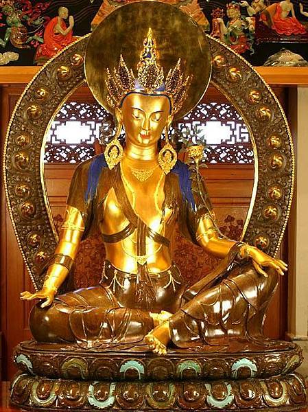體態特徵:戴著一頂很大的五佛冠,手持如意