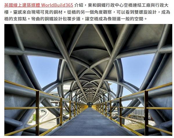 英國線上建築媒體 WorldBuild365 介紹,東和鋼鐵行政中心空橋連結工廠與行政大樓,靈感來自現場可見的鋼材。從橋的另一個角度觀察,可以看到雙螺旋設計,成為橋的支撐點。彎曲的鋼鐵設計包覆步道,讓空橋成為像隧道一般的空間。
