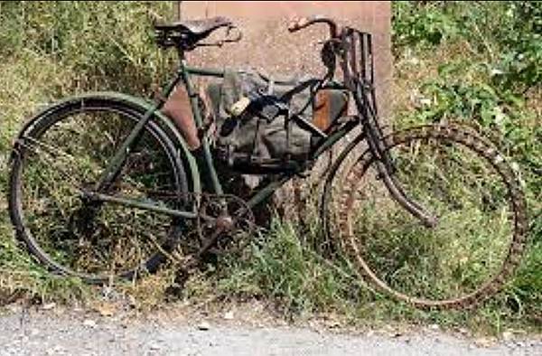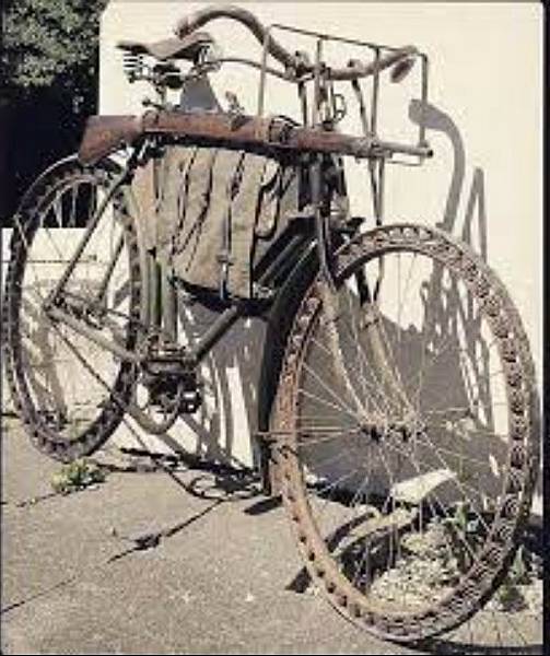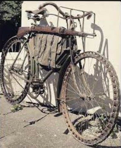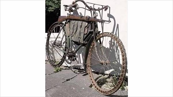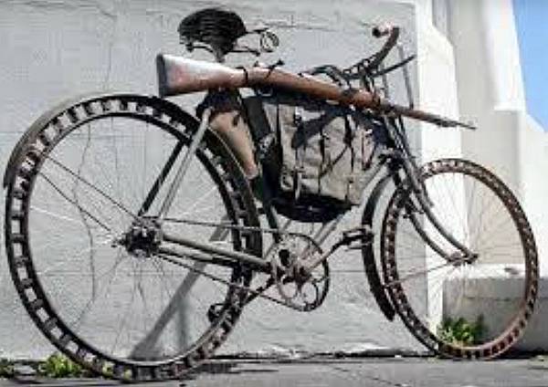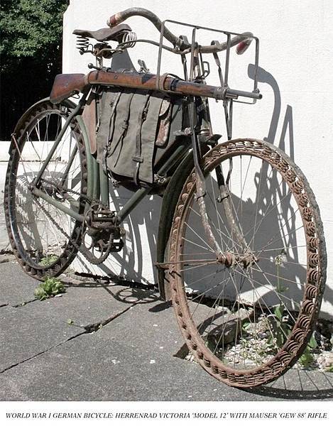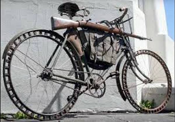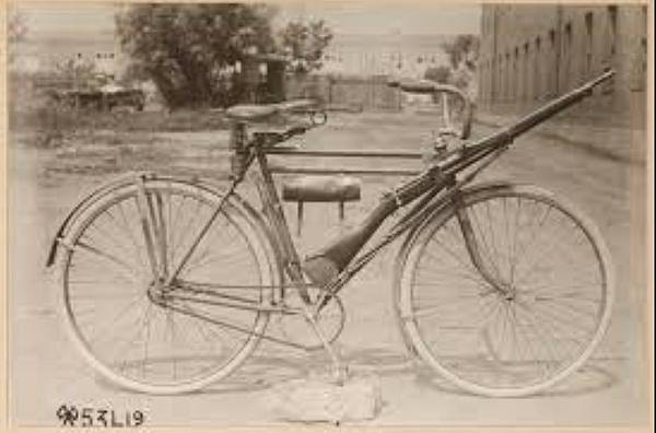 與彈簧輪子的軍用自行車。 1900 年代初期