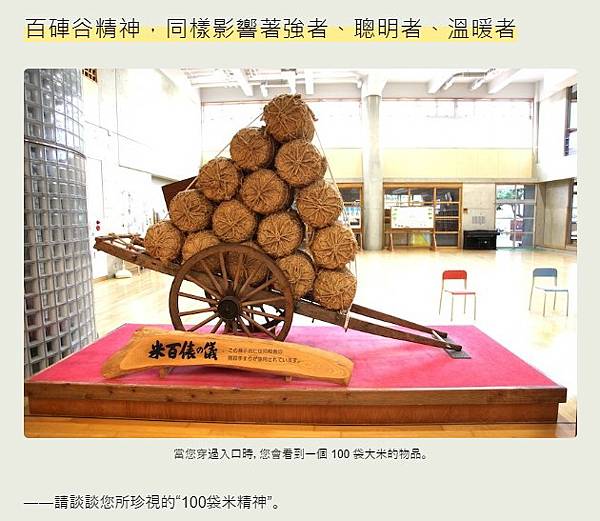 “100袋米的精神” 「米百俵」(百袋大米)。明治初期,赤貧的長岡藩接受了100袋米的救濟。為了活用這100袋米,分給武士和領地居民的話,過幾天就沒了,將來一千麻袋,十萬麻袋,用來興辦學堂。結果,建立的學校產生了一系列的人力資源。這種精神被稱為“百硨谷精神”,其理念是教育投資是國家建設最重要的投資。